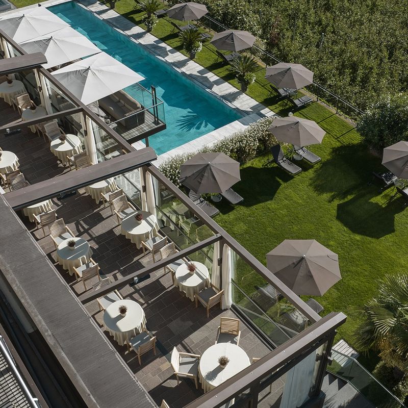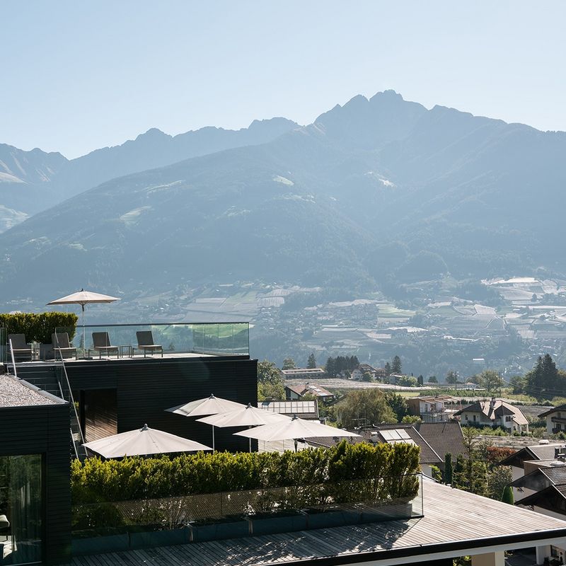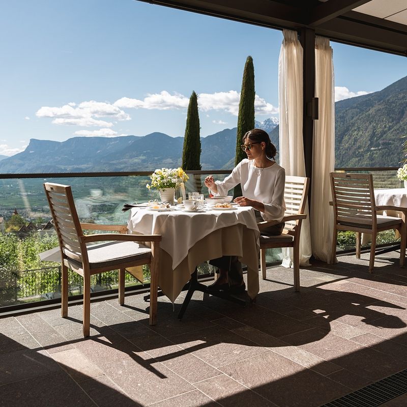 Sulla nostra terrazza soleggiata ogni momento di benessere è una vera festa. Con delicatezze regionali sul piatto e il paesaggio suggestivo di Merano e i suoi dintorni ai vostri piedi. Lasciatevi ispirare dall’aria fresca e un panorama senza limiti, con 220 giornate di sole all’anno.